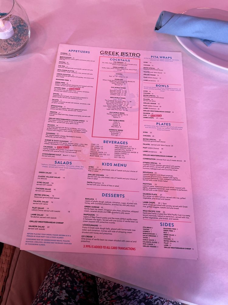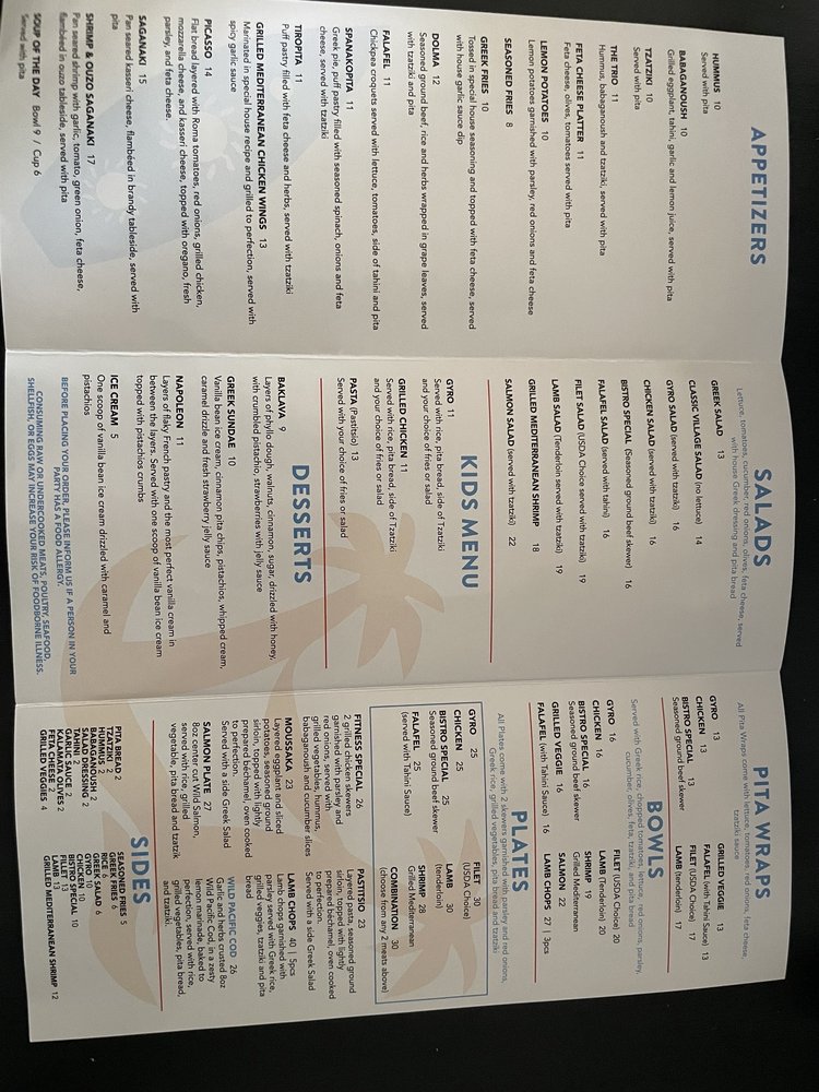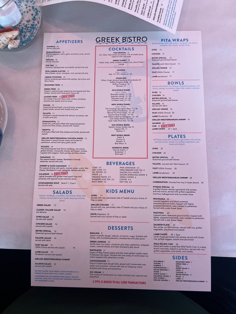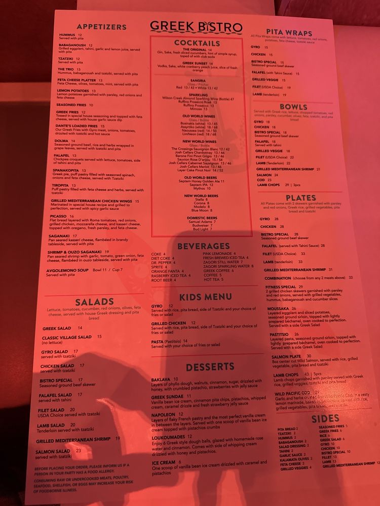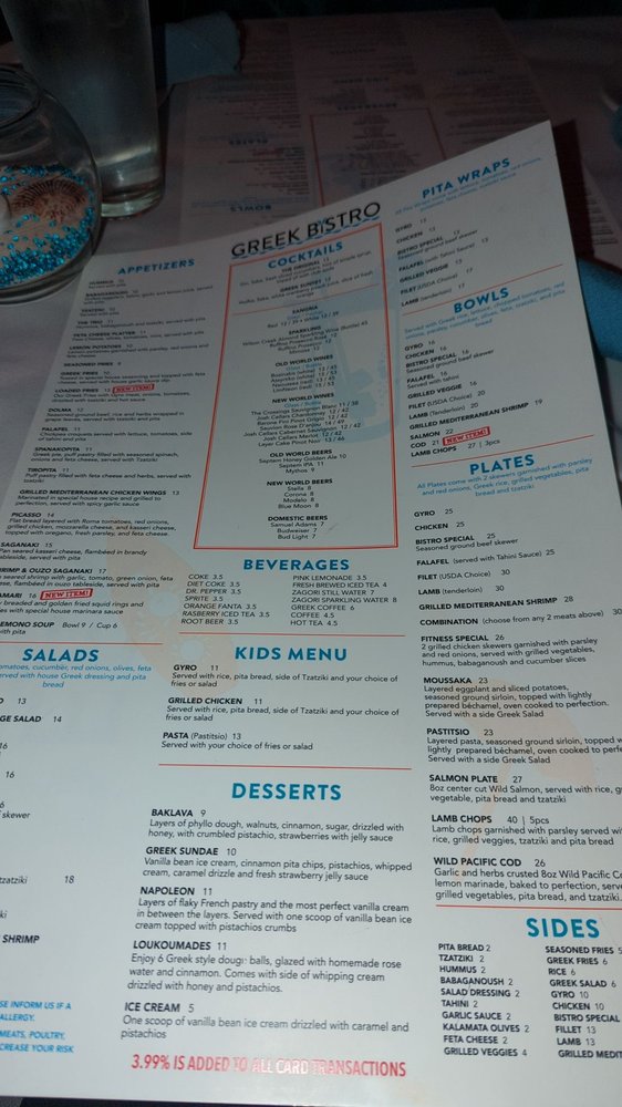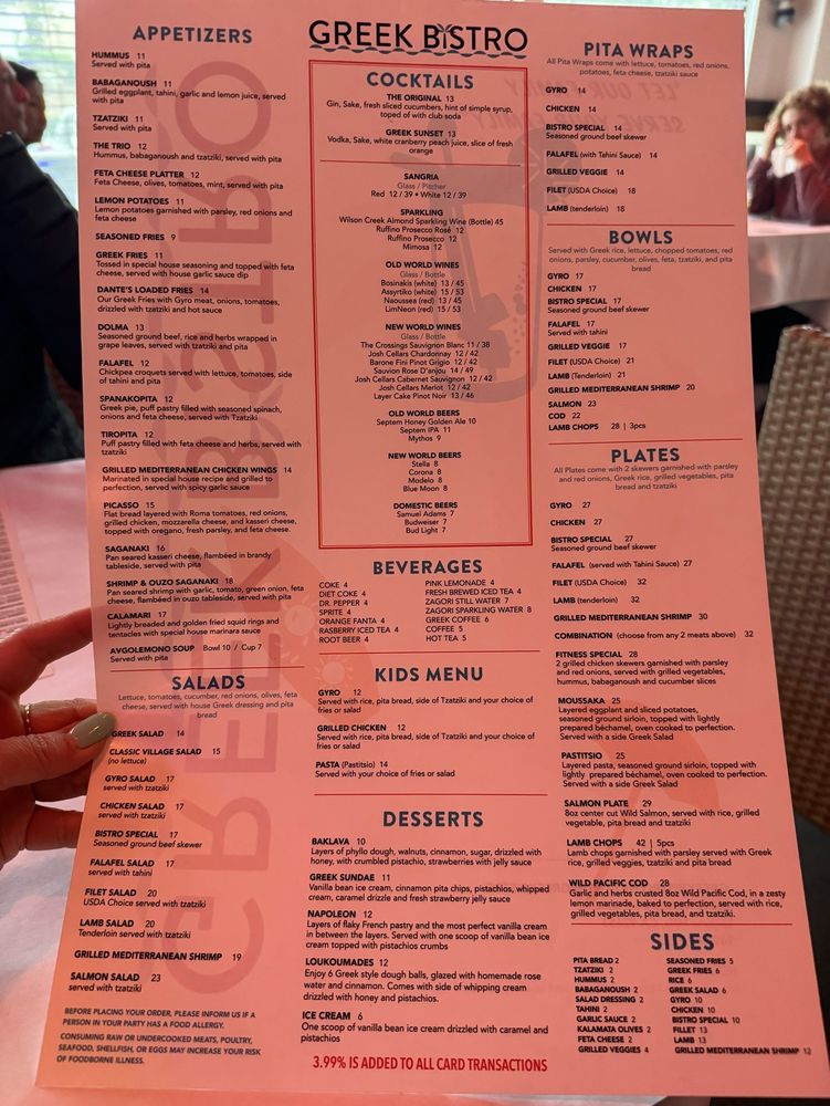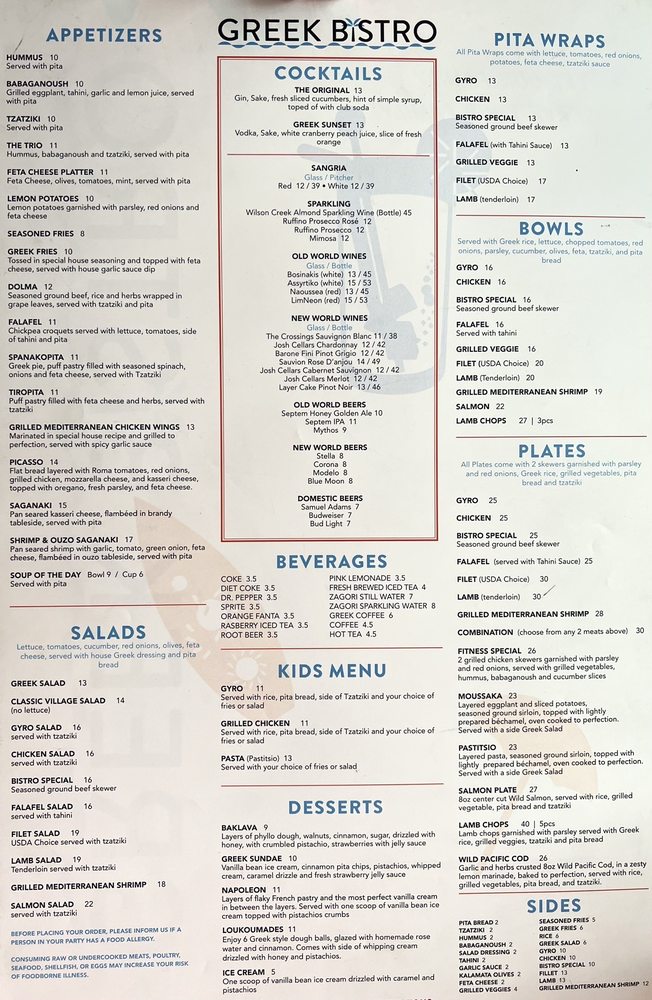 Greek Bistro, located in Laguna Hills, CA, offers a diverse menu with Mediterranean dishes. From appetizers like Babaganoush and Falafel to salads like Gyro and Lamb, the options cater to various preferences. Pita wraps such as Filet and Bistro Special are also available. Customers praise the freshness and flavor of the food, with standout items like Lemon Chicken soup and the trio appetizer of babaganoush, hummus, and tzatziki. The restaurant also provides options for vegans and vegetarians, making it inclusive for all dietary needs. The cozy atmosphere and friendly service add to the overall dining experience. With positive reviews from customers highlighting the quality of the food and service, Greek Bistro stands out as a must-visit spot for Mediterranean cuisine lovers.